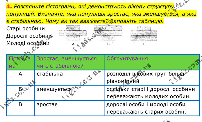 Розгляньте гістограми, які демонструють вікову структуру популяцій. Визначте, яка популяція зростає, яка зменшується, а яка є стабільною. Чому ви так вважаєте? Заповніть таблицю. Старі особини Дорослі особини Молоді особини