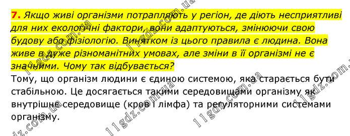 Якщо живі організми потрапляють у регіон, де діють несприятливі для них екологічні фактори, вони адаптуються, змінюючи свою будову або фізіологію. Винятком із цього правила є людина. Вона живе в дуже різноманітних умовах, але зміни в її організмі не є значними. Чому так відбувається? Тому, що організм людини є єдиною системою, яка старається бути стабільною. Це досягається такими середовищами організму як внутрішнє середовище (кров і лімфа) та регуляторними системами організму.