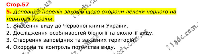 5. Доповніть перелік заходів щодо охорони лелеки чорного на території України. 1. Внесення виду до Червоної книги України. 2. Дослідження особливостей біології та екології виду. 3. Створення заповідних та заказних територій. 4. Охорона та контроль потомства виду.