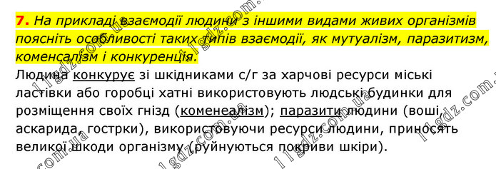 На прикладі взаємодії людини з іншими видами живих організмів поясніть особливості таких типів взаємодії, як мутуалізм, паразитизм, коменсалізм і конкуренція. Людина конкурує зі шкідниками с/г за харчові ресурси міські ластівки або горобці хатні використовують людські будинки для розміщення своїх гнізд (коменеалізм); паразити людини (воші, аскарида, гострки), використовуючи ресурси людини, приносять великої шкоди організму (руйнуються покриви шкіри).