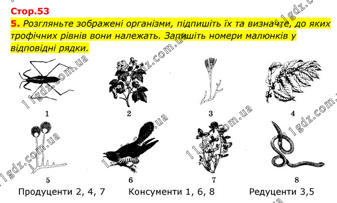 Розгляньте зображені організми, підпишіть їх та визначте, до яких трофічних рівнів вони належать. Запишіть номери малюнків у відповідні рядки.