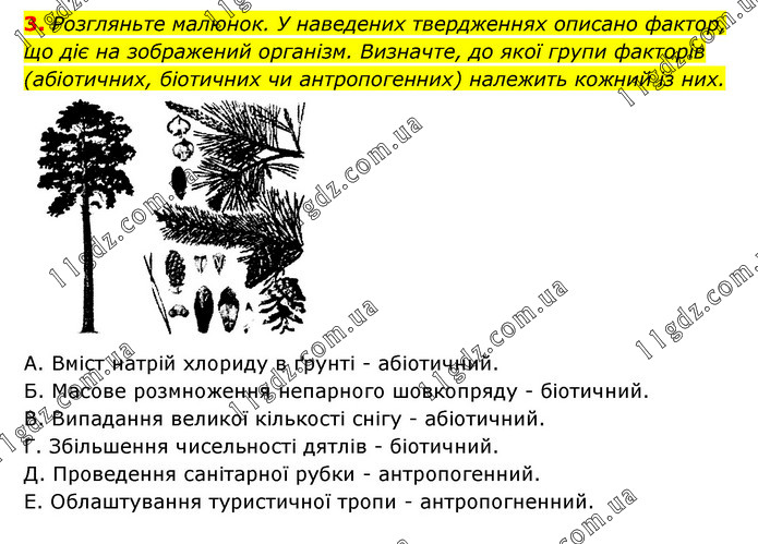 Розгляньте малюнок. У наведених твердженнях описано фактор, що діє на зображений організм. Визначте, до якої групи факторів (абіотичних, біотичних чи антропогенних) належить кожний із них. А. Вміст натрій хлориду в ґрунті - абіотичний. Б. Масове розмноження непарного шовкопряду - біотичний. В. Випадання великої кількості снігу - абіотичний. Г. Збільшення чисельності дятлів - біотичний. Д. Проведення санітарної рубки - антропогенний. Е. Облаштування туристичної тропи - антропогненний.