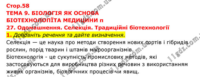 ТЕМА 9. БІОЛОГІЯ ЯК ОСНОВА БІОТЕХНОЛОПЇТА МЕДИЦИНИ п 27. Одомашнення. Селекція. Традиційні біотехнології 1. Доповніть речення та дайте визначення. Селекція — це наука про методи створення нових сортів і гібридів рослин, порід тварин і штамів мікроорганізмів. Біотехнологія - це сукупність промислових методів, які застосовуються для виробництва різних речовин з використанням живих організмів, біологічних процесів чи явищ.
