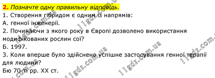 Позначте одну правильну відповідь. 1. Створення гібридом є одним із напрямів: А. генної інженерії. 2. Починаючи з якого року в Європі дозволено використання модифікованих рослин сої? Б. 1997. 3. Коли вперше було здійснено успішне застосування генної терапії для людини? Бю 70-ті рр. XX ст.