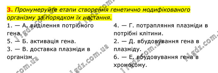 3. Пронумеруйте етапи створення генетично модифікованого організму за порядком їх настання. 1. — А. виділення потрібного гена. 5. — Б. активація гена. 3. — В. доставка плазміди в організм. 4. — Г. потрапляння плазміди в потрібні клітини. 2. — Д. вбудовування гена в плазміду. 6. — Е. вбудовування гена в хромосому.
