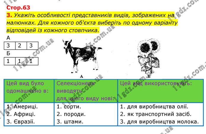 Укажіть особливості представників видів, зображених на малюнках. Для кожного об'єкта виберіть по одному варіанту відповідей із кожного стовпчика.