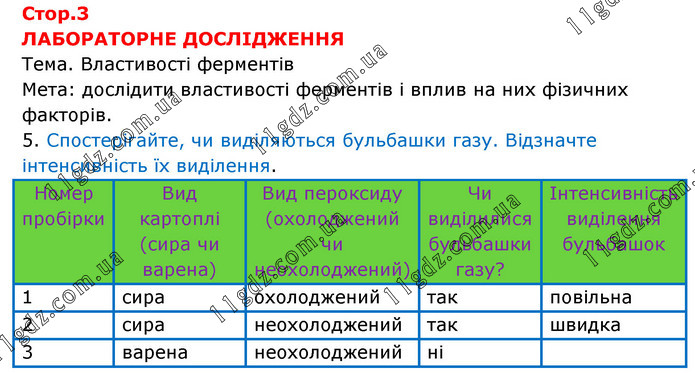 ЛАБОРАТОРНЕ ДОСЛІДЖЕННЯ Тема. Властивості ферментів Мета: дослідити властивості ферментів і вплив на них фізичних факторів. 5. Спостерігайте, чи виділяються бульбашки газу. Відзначте інтенсивність їх виділення.