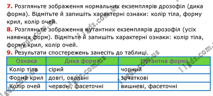 7. Розгляньте зображення нормальних екземплярів дрозофіл (дика форма). Відмітьте й запишіть характерні ознаки: колір тіла, форму крил, колір очей. 8. Розгляньте зображення мутантних екземплярів дрозофіл (усіх наявних форм). Відмітьте й запишіть характерні ознаки: колір тіла, форму крил, колір очей. 9. Результати спостережень занесіть до таблиці.