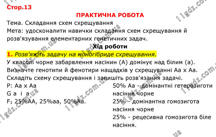ПРАКТИЧНА РОБОТА Тема. Складання схем схрещування Мета: удосконалити навички складання схем схрещування й розв'язування елементарних генетичних задач. Хід роботи 1. Розв'яжіть задачу на моногібриде схрещування. У квасолі чорне забарвлення насінин (А) домінує над білим (а). Визначте генотипи й фенотири нащадків у схрещуванні Аа х Аа. Складіть схему схрещування і запишіть розв'язання задачі. P: Aa x Aa G a i a F1 25%AA, 25%aa, 50%Aa. 50% Aa - домінантні гетерозиготи насіння чорне 25% - домінантна гомозигота насіння чорне 25% - рецесивна гомозигота біле насіння.