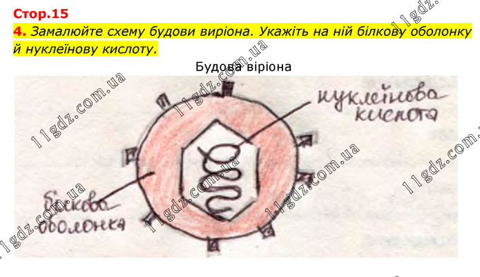 4. Замалюйте схему будови виріона. Укажіть на ній білкову оболонку й нуклеїнову кислоту.