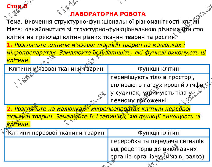 ЛАБОРАТОРНА РОБОТА Тема. Вивчення структурно-функціональної різноманітності клітин Мета: ознайомитися зі структурно-функціональною різноманітністю клітин на прикладі клітин різних тканин тварин та рослин. 1. Розгляньте клітини м'язової тканини тварин на малюнках і мікропрепаратах. Замалюйте їх й запишіть, які функції виконують ці клітини. Клітини м'язової тканини тварин Функції клітин переміщують тіло в просторі, впливають на рух крові й лімфи у судинах, утримують тіла у певному положенні 2. Розгляньте на малюнках і мікропрепаратах клітини нервової тканини тварин. Замалюйте їх і запишіть, які функції виконують ці клітини. Клітини нервової тканини тварин Функції клітин переробка та передача сигналів від рецепторів до виконавчих органів організму (м’язів, залоз)