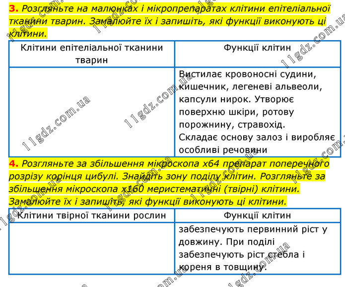 Розгляньте на малюнках і мікропрепаратах клітини епітеліальної тканини тварин. Замалюйте їх і запишіть, які функції виконують ці клітини. 4. Розгляньте за збільшення мікроскопа х64 препарат поперечного розрізу корінця цибулі. Знайдіть зону поділу клітин. Розгляньте за збільшення мікроскопа х160 меристематичні (твірні) клітини. Замалюйте їх і запишіть, які функції виконують ці клітини.