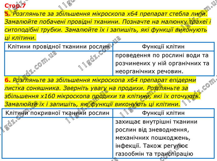 5. Розгляньте за збільшення мікроскопа х64 препарат стебла липи. Замалюйте побачені провідні тканини. Позначте на малюнку трахеї і ситоподібні трубки. Замалюйте їх і запишіть, які функції виконують ці клітини. 6. Розгляньте за збільшення мікроскопа х64 препарат епідерми листка соняшника. Зверніть увагу на продихи. Розгляньте за збільшення х160 мікроскопа продихи та клітини, які їх оточують. Замалюйте їх і запишіть, які функції виконують ці клітини.