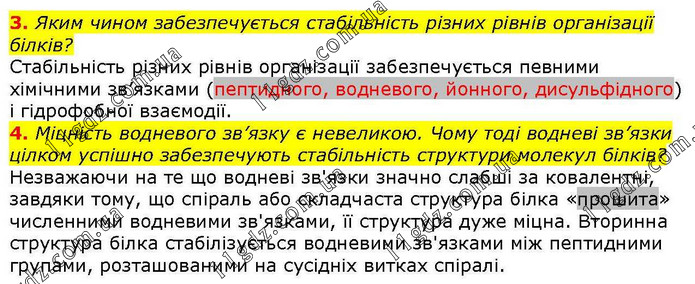 3. Яким чином забезпечується стабільність різних рівнів організації білків? Стабільність різних рівнів організації забезпечується певними хімічними зв’язками (пептидного, водневого, йонного, дисульфідного) і гідрофобної взаємодії. 4. Міцність водневого зв’язку є невеликою. Чому тоді водневі зв’язки цілком успішно забезпечують стабільність структури молекул білків? Незважаючи на те що водневі зв'язки значно слабші за ковалентні, завдяки тому, що спіраль або складчаста структура білка «прошита» численними водневими зв'язками, її структура дуже міцна. Вторинна структура білка стабілізується водневими зв'язками між пептидними групами, розташованими на сусідніх витках спіралі.