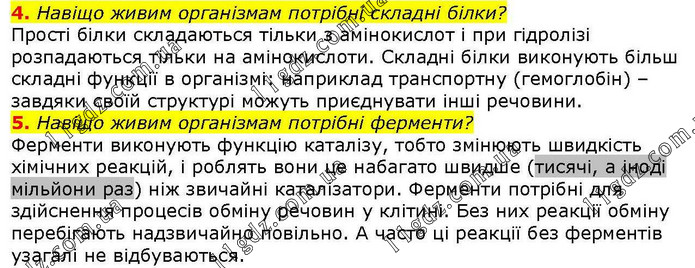4. Навіщо живим організмам потрібні складні білки? Прості білки складаються тільки з амінокислот і при гідролізі розпадаються тільки на амінокислоти. Складні білки виконують більш складні функції в організмі: наприклад транспортну (гемоглобін) – завдяки своїй структурі можуть приєднувати інші речовини. 5. Навіщо живим організмам потрібні ферменти? Ферменти виконують функцію каталізу, тобто змінюють швидкість хімічних реакцій, і роблять вони це набагато швидше (тисячі, а іноді мільйони раз) ніж звичайні каталізатори. Ферменти потрібні для здійснення процесів обміну речовин у клітині. Без них реакції обміну перебігають надзвичайно повільно. А часто ці реакції без ферментів узагалі не відбуваються.