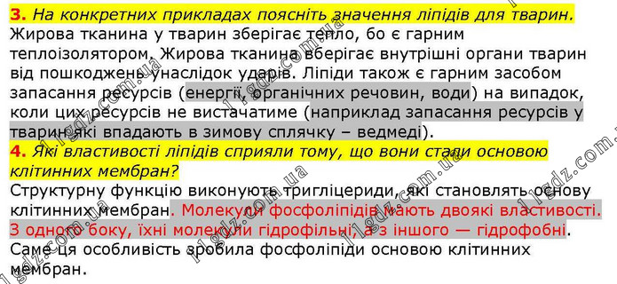 3. На конкретних прикладах поясніть значення ліпідів для тварин. Жирова тканина у тварин зберігає тепло, бо є гарним теплоізолятором. Жирова тканина вберігає внутрішні органи тварин від пошкоджень унаслідок ударів. Ліпіди також є гарним засобом запасання ресурсів (енергії, органічних речовин, води) на випадок, коли цих ресурсів не вистачатиме (наприклад запасання ресурсів у тварин які впадають в зимову сплячку – ведмеді). 4. Які властивості ліпідів сприяли тому, що вони стали основою клітинних мембран? Структурну функцію виконують тригліцериди, які становлять основу клітинних мембран. Молекули фосфоліпідів мають двоякі властивості. З одного боку, їхні молекули гідрофільні, а з іншого — гідрофобні. Саме ця особливість зробила фосфоліпіди основою клітинних мембран.