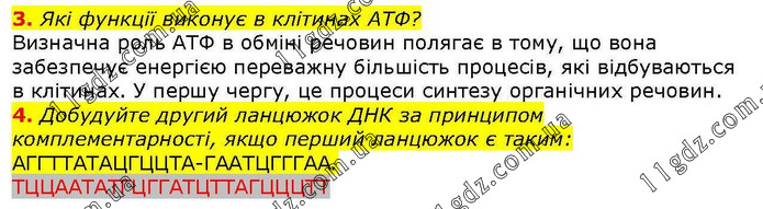 3. Які функції виконує в клітинах АТФ? Визначна роль АТФ в обміні речовин полягає в тому, що вона забезпечує енергією переважну більшість процесів, які відбуваються в клітинах. У першу чергу, це процеси синтезу органічних речовин. 4. Добудуйте другий ланцюжок ДНК за принципом комплементарності, якщо перший ланцюжок є таким: АГГТТАТАЦГЦЦТА-ГААТЦГГГАА. ТЦЦААТАТГЦГГАТЦТТАГЦЦЦТТ