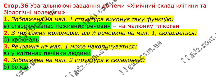 Стор.36 Узагальнюючі завдання до теми «Хімічний склад клітини та біологічні молекули» 1. Зображена на мал. 1 структура виконує таку функцію: в) створює запас поживних речовин – на малюнку глікоген 2. З тих самих мономерів, що й речовина на мал. 1, складається: б) крохмаль 3. Речовина на мал. 1 може накопичуватися: в) у клітинах печінки людини 4. Зображена на мал. 2 структура є складовою: б) білків