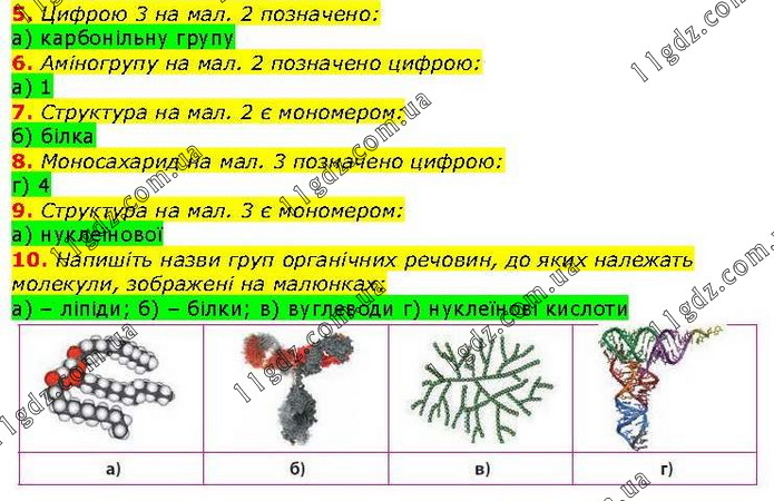 5. Цифрою 3 на мал. 2 позначено: а) карбонільну групу 6. Аміногрупу на мал. 2 позначено цифрою: а) 1 7. Структура на мал. 2 є мономером: б) білка 8. Моносахарид на мал. 3 позначено цифрою: г) 4 9. Структура на мал. 3 є мономером: а) нуклеїнової 10. Напишіть назви груп органічних речовин, до яких належать молекули, зображені на малюнках: а) – ліпіди; б) – білки; в) вуглеводи г) нуклеїнові кислоти