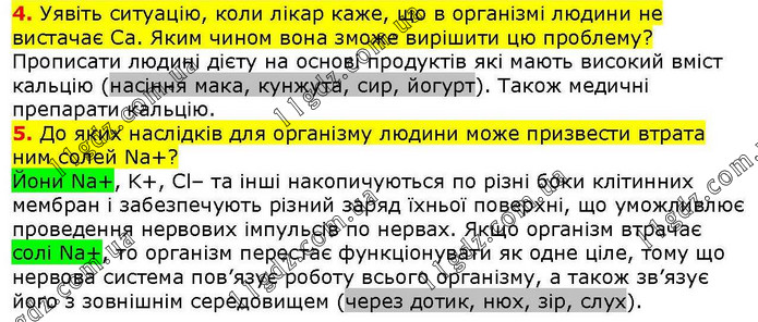 4. Уявіть ситуацію, коли лікар каже, що в організмі людини не вистачає Ca. Яким чином вона зможе вирішити цю проблему? Прописати людині дієту на основі продуктів які мають високий вміст кальцію (насіння мака, кунжута, сир, йогурт). Також медичні препарати кальцію. 5. До яких наслідків для організму людини може призвести втрата ним солей Na+? Йони Na+, K+, Cl– та інші накопичуються по різні боки клітинних мембран і забезпечують різний заряд їхньої поверхні, що уможливлює проведення нервових імпульсів по нервах. Якщо організм втрачає солі Na+, то організм перестає функціонувати як одне ціле, тому що нервова система пов’язує роботу всього організму, а також зв’язує його з зовнішнім середовищем (через дотик, нюх, зір, слух).