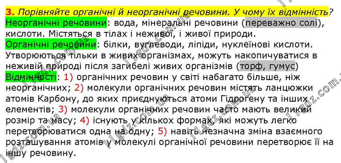 Порівняйте органічні й неорганічні речовини. У чому їх відмінність? Неорганічні речовини: вода, мінеральні речовини (переважно солі), кислоти. Містяться в тілах і неживої, і живої природи. Органічні речовини: білки, вуглеводи, ліпіди, нуклеїнові кислоти. Утворюються тільки в живих організмах, можуть накопичуватися в неживій природі після загибелі живих організмів (торф, гумус) Відмінності: 1) органічних речовин у світі набагато більше, ніж неорганічних; 2) молекули органічних речовин містять ланцюжки атомів Карбону, до яких приєднуються атоми Гідрогену та інших елементів; 3) молекули органічних речовин часто мають великий розмір та масу; 4) існують у кількох формах, які можуть легко перетворюватися одна на одну; 5) навіть незначна зміна взаємного розташування атомів у молекулі органічної речовини перетворює її на іншу речовину.