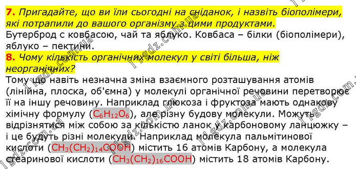 7. Пригадайте, що ви їли сьогодні на сніданок, і назвіть біополімери, які потрапили до вашого організму з цими продуктами. Бутерброд с ковбасою, чай та яблуко. Ковбаса – білки (біополімери), яблуко – пектини. 8. Чому кількість органічних молекул у світі більша, ніж неорганічних? Тому що навіть незначна зміна взаємного розташування атомів (лінійна, плоска, об'ємна) у молекулі органічної речовини перетворює її на іншу речовину. Наприклад глюкоза і фруктоза мають однакову хімічну формулу (C6H12O6), але різну будову молекули. Можуть відрізнятися між собою за кількістю ланок у карбоновому ланцюжку – і це будуть різні молекули. Наприклад молекула пальмітинової кислоти (CH3(CH2)14COOH) містить 16 атомів Карбону, а молекула стеаринової кислоти (CH3(CH2)16COOH) містить 18 атомів Карбону.