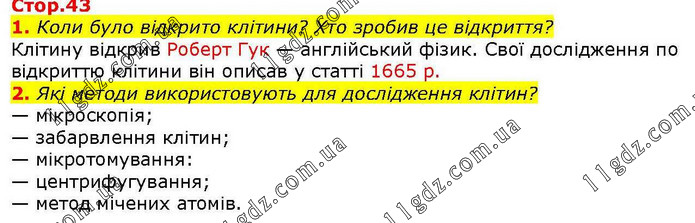 1. Коли було відкрито клітини? Хто зробив це відкриття? Клітину відкрив Роберт Гук — англійський фізик. Свої дослідження по відкриттю клітини він описав у статті 1665 р. 2. Які методи використовують для дослідження клітин? — мікроскопія; — забарвлення клітин; — мікротомування: — центрифугування; — метод мічених атомів.
