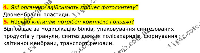 4. Які органели здійснюють процес фотосинтезу? Двомембранні пластиди. 5. Навіщо клітинам потрібен комплекс Гольджі? Відповідає за модифікацію білків, упаковування синтезованих продуктів у гранули, синтез деяких полісахаридів, формування клітинної мембрани, транспорт речовин.