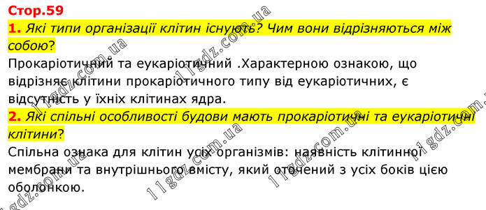 1. Які типи організації клітин існують? Чим вони відрізняються між собою? Прокаріотичний та еукаріотичний .Характерною ознакою, що відрізняє клітини прокаріотичного типу від еукаріотичних, є відсутність у їхніх клітинах ядра. 2. Які спільні особливості будови мають прокаріотичні та еукаріотичні клітини? Спільна ознака для клітин усіх організмів: наявність клітинної мембрани та внутрішнього вмісту, який оточений з усіх боків цією оболонкою.