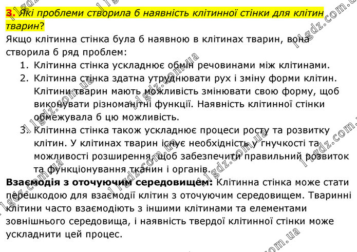 Які проблеми створила б наявність клітинної стінки для клітин тварин? Якщо клітинна стінка була б наявною в клітинах тварин, вона створила б ряд проблем: 1. Клітинна стінка ускладнює обмін речовинами між клітинами. 2. Клітинна стінка здатна утруднювати рух і зміну форми клітин. Клітини тварин мають можливість змінювати свою форму, щоб виконувати різноманітні функції. Наявність клітинної стінки обмежувала б цю можливість. 3. Клітинна стінка також ускладнює процеси росту та розвитку клітин. У клітинах тварин існує необхідність у гнучкості та можливості розширення, щоб забезпечити правильний розвиток та функціонування тканин і органів. Взаємодія з оточуючим середовищем: Клітинна стінка може стати перешкодою для взаємодії клітин з оточуючим середовищем. Тваринні клітини часто взаємодіють з іншими клітинами та елементами зовнішнього середовища, і наявність твердої клітинної стінки може ускладнити цей процес.