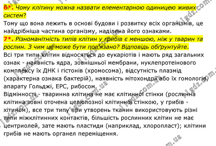 6*. Чому клітину можна назвати елементарною одиницею живих систем? Тому що вона лежить в основі будови і розвитку всіх організмів, це найдрібніша частина організму, наділена його ознаками. 7*. Різноманітність типів клітин у грибів є меншою, ніж у тварин та рослин. З чим це може бути пов’язано? Відповідь обґрунтуйте. Всі три типи клітин відносяться до еукаріотів і мають ряд загальних ознак - наявність ядра, зовнішньої мембрани, нуклепротеінового комплексу їх ДНК і гістонів (хромосома), відсутність плазмід (характерна ознака бактерій), наявність мітохондрії або їх гомологів, апарату Гольджі, ЕРС, рибосом. Відмінності - тваринна клітина не має клітинної стінки (рослинна клітина зовні оточена целюлозної клітинної стінкою, у грибів - хітином), все три типу при утворень тканин використовують різні типи міжклітинних контактів, більшість рослинних клітин не має центриолей, зате мають пластиди (наприклад, хлоропласт); клітини грибів не мають органел переміщення.