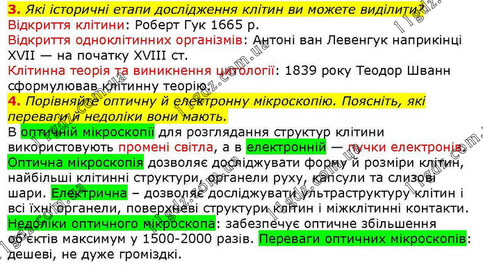 3. Які історичні етапи дослідження клітин ви можете виділити? Відкриття клітини: Роберт Гук 1665 р. Відкриття одноклітинних організмів: Антоні ван Левенгук наприкінці XVII — на початку XVIII ст. Клітинна теорія та виникнення цитології: 1839 року Теодор Шванн сформулював клітинну теорію. 4. Порівняйте оптичну й електронну мікроскопію. Поясніть, які переваги й недоліки вони мають. В оптичній мікроскопії для розглядання структур клітини використовують промені світла, а в електронній — пучки електронів. Оптична мікроскопія дозволяє досліджувати форму й розміри клітин, найбільші клітинні структури, органели руху, капсули та слизові шари. Електрична – дозволяє досліджувати ультраструктуру клітин і всі їхні органели, поверхневі структури клітин і міжклітинні контакти. Недоліки оптичного мікроскопа: забезпечує оптичне збільшення об’єктів максимум у 1500-2000 разів. Переваги оптичних мікроскопів: дешеві, не дуже громіздкі.