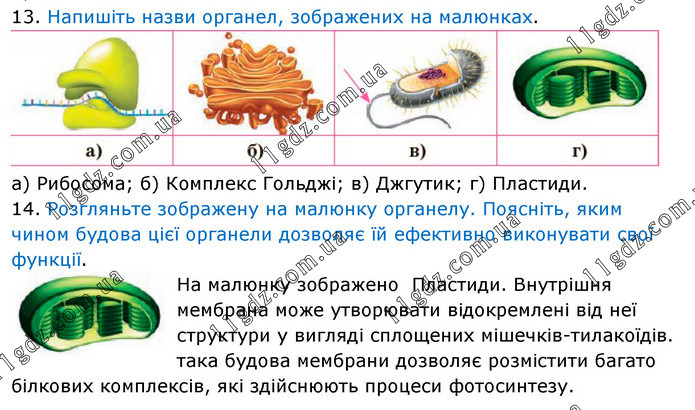 13. Напишіть назви органел, зображених на малюнках. а) Рибосома; б) Комплекс Гольджі; в) Джгутик; г) Пластиди. 14. Розгляньте зображену на малюнку органелу. Поясніть, яким чином будова цієї органели дозволяє їй ефективно виконувати свої функції. На малюнку зображено Пластиди. Внутрішня мембрана може утворювати відокремлені від неї структури у вигляді сплощених мішечків-тилакоїдів. така будова мембрани дозволяє розмістити багато білкових комплексів, які здійснюють процеси фотосинтезу.
