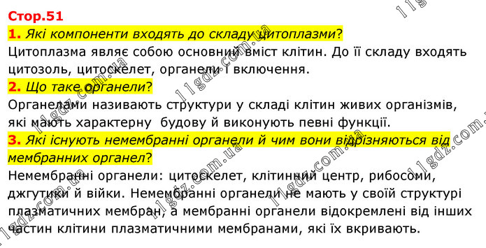 1. Які компоненти входять до складу цитоплазми? Цитоплазма являє собою основний вміст клітин. До її складу входять цитозоль, цитоскелет, органели і включення. 2. Що таке органели? Органелами називають структури у складі клітин живих організмів, які мають характерну будову й виконують певні функції. 3. Які існують немембранні органели й чим вони відрізняються від мембранних органел? Немембранні органели: цитоскелет, клітинний центр, рибосоми, джгутики й війки. Немембранні органели не мають у своїй структурі плазматичних мембран, а мембранні органели відокремлені від інших частин клітини плазматичними мембранами, які їх вкривають.