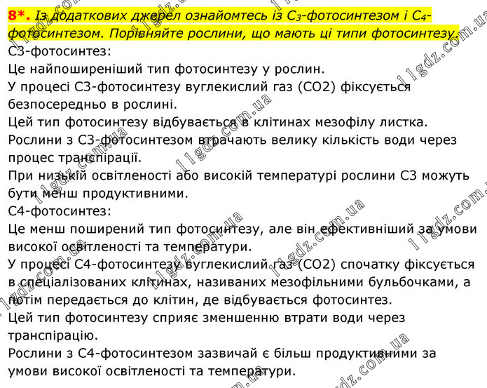 Із додаткових джерел ознайомтесь із С3-фотосинтезом і С4-фотосинтезом. Порівняйте рослини, що мають ці типи фотосинтезу. C3-фотосинтез: Це найпоширеніший тип фотосинтезу у рослин. У процесі C3-фотосинтезу вуглекислий газ (CO2) фіксується безпосередньо в рослині. Цей тип фотосинтезу відбувається в клітинах мезофілу листка. Рослини з C3-фотосинтезом втрачають велику кількість води через процес транспірації. При низькій освітленості або високій температурі рослини C3 можуть бути менш продуктивними. C4-фотосинтез: Це менш поширений тип фотосинтезу, але він ефективніший за умови високої освітленості та температури. У процесі С4-фотосинтезу вуглекислий газ (CO2) спочатку фіксується в спеціалізованих клітинах, називаних мезофільними бульбочками, а потім передається до клітин, де відбувається фотосинтез. Цей тип фотосинтезу сприяє зменшенню втрати води через транспірацію. Рослини з С4-фотосинтезом зазвичай є більш продуктивними за умови високої освітленості та температури.