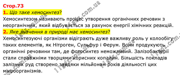1. Що таке хемосинтез? Хемосинтезом називають процес утворення органічних речовин з неорганічних, який відбувається за рахунок енергії хімічних реакцій. 2. Яке значення в природі має хемосинтез? Хемосинтезуючі організми відіграють дуже важливу роль у колообігу таких елементів, як Нітроген, Сульфур і Ферум. Вони продукують органічні речовини там, де фотосинтез неможливий. Залізобактерії стали справжніми творцями корисних копалин. Більшість покладів залізних руд створено завдяки мільйонам років діяльності цих мікроорганізмів.