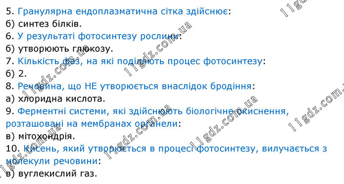 5. Гранулярна ендоплазматична сітка здійснює: б) синтез білків. 6. У результаті фотосинтезу рослини: б) утворюють глюкозу. 7. Кількість фаз, на які поділяють процес фотосинтезу: б) 2. 8. Речовина, що НЕ утворюється внаслідок бродіння: а) хлоридна кислота. 9. Ферментні системи, які здійснюють біологічне окиснення, розташовані на мембранах органели: в) мітохондрія. 10. Кисень, який утворюється в процесі фотосинтезу, вилучається з молекули речовини: в) вуглекислий газ.