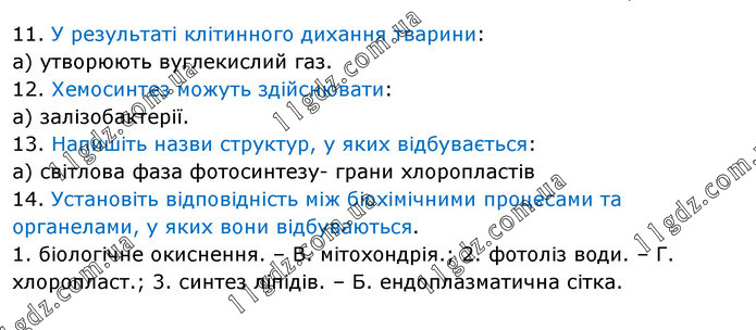11. У результаті клітинного дихання тварини: а) утворюють вуглекислий газ. 12. Хемосинтез можуть здійснювати: а) залізобактерії. 13. Напишіть назви структур, у яких відбувається: а) світлова фаза фотосинтезу- грани хлоропластів 14. Установіть відповідність між біохімічними процесами та органелами, у яких вони відбуваються. 1. біологічне окиснення. – В. мітохондрія.; 2. фотоліз води. – Г. хлоропласт.; 3. синтез ліпідів. – Б. ендоплазматична сітка.