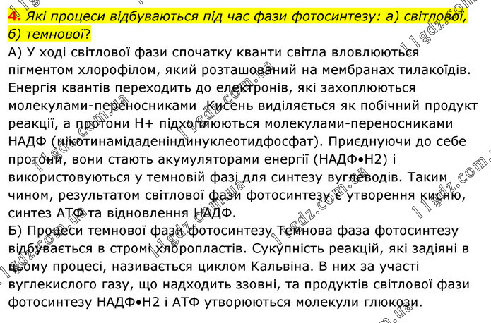 Які процеси відбуваються під час фази фотосинтезу: а) світлової, б) темнової? А) У ході світлової фази спочатку кванти світла вловлюються пігментом хлорофілом, який розташований на мембранах тилакоїдів. Енергія квантів переходить до електронів, які захоплюються молекулами-переносниками .Кисень виділяється як побічний продукт реакції, а протони Н+ підхоплюються молекулами-переносниками НАДФ (нікотинамідаденіндинуклеотидфосфат). Приєднуючи до себе протони, вони стають акумуляторами енергії (НАДФ•Н2) і використовуються у темновій фазі для синтезу вуглеводів. Таким чином, результатом світлової фази фотосинтезу є утворення кисню, синтез АТФ та відновлення НАДФ. Б) Процеси темнової фази фотосинтезу Темнова фаза фотосинтезу відбувається в стромі хлоропластів. Сукупність реакцій, які задіяні в цьому процесі, називається циклом Кальвіна. В них за участі вуглекислого газу, що надходить ззовні, та продуктів світлової фази фотосинтезу НАДФ•Н2 і АТФ утворюються молекули глюкози.