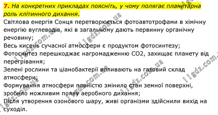 На конкретних прикладах поясніть, у чому полягає планетарна роль клітинного дихання. · Світлова енергія Сонця перетворюється фотоавтотрофами в хімічну енергію вуглеводів, які в загальному дають первинну органічну речовину; · Весь кисень сучасної атмосфери є продуктом фотосинтезу; · Фотосинтез перешкоджає нагромадженню СО2, захищає планету від перегрівання; · Зелені рослини та ціанобактерії впливають на газовий склад атмосфери; · Формування атмосфери повністю змінило стан земної поверхні, зробило можливим появу аеробного дихання; Після утворення озонового шару, живі організми здійснили вихід на суходіл.