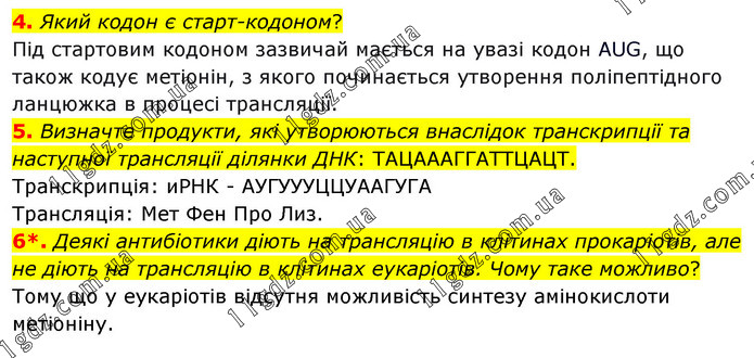 4. Який кодон є старт-кодоном? Під стартовим кодоном зазвичай мається на увазі кодон AUG, що також кодує метіонін, з якого починається утворення поліпептідного ланцюжка в процесі трансляції. 5. Визначте продукти, які утворюються внаслідок транскрипції та наступної трансляції ділянки ДНК: ТАЦАААГГАТТЦАЦТ. Транскрипція: иРНК - АУГУУУЦЦУААГУГА Трансляція: Мет Фен Про Лиз. 6*. Деякі антибіотики діють на трансляцію в клітинах прокаріотів, але не діють на трансляцію в клітинах еукаріотів. Чому таке можливо? Тому що у еукаріотів відсутня можливість синтезу амінокислоти метіоніну.