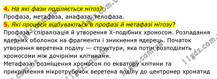 4. На які фази поділяється мітоз? Профаза, метафаза, анафаза, телофаза. 5. Які процеси відбуваються в профазі й метафазі мітозу? Профаза- спіралізація й утворення X-подібних хромосом. Розпадання ядерних оболонок на фрагменти і зникнення ядерець. Початок утворення веретена поділу — структури, яка потім розподілить хромосоми між дочірніми клітинами. Метафаза- розміщення хромосом по екватору клітини та прикріплення мікротрубочок веретена поділу до центромер хроматид