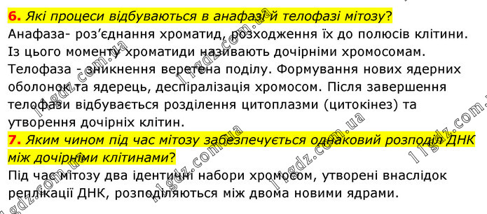 6. Які процеси відбуваються в анафазі й телофазі мітозу? Анафаза- роз’єднання хроматид, розходження їх до полюсів клітини. Із цього моменту хроматиди називають дочірніми хромосомам. Телофаза - зникнення веретена поділу. Формування нових ядерних оболонок та ядерець, деспіралізація хромосом. Після завершення телофази відбувається розділення цитоплазми (цитокінез) та утворення дочірніх клітин. 7. Яким чином під час мітозу забезпечується однаковий розподіл ДНК між дочірніми клітинами? Під час мітозу два ідентичні набори хромосом, утворені внаслідок реплікації ДНК, розподіляються між двома новими ядрами.