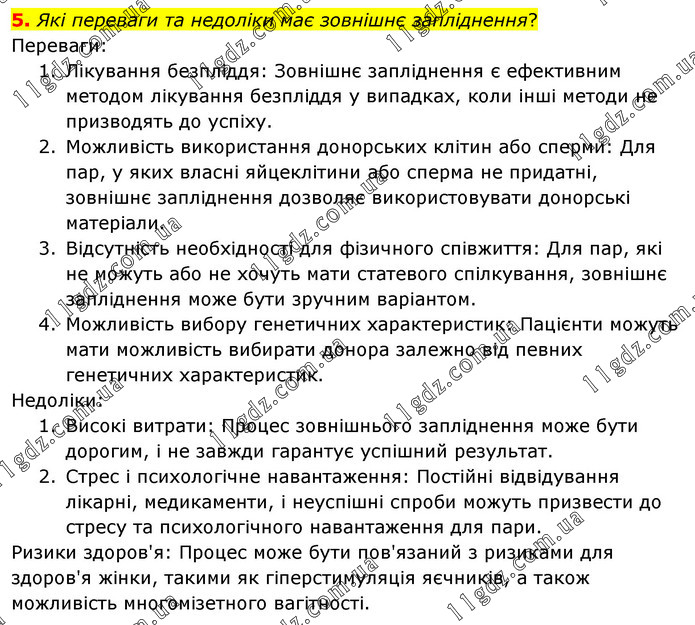 Які переваги та недоліки має зовнішнє запліднення? Переваги: 1. Лікування безпліддя: Зовнішнє запліднення є ефективним методом лікування безпліддя у випадках, коли інші методи не призводять до успіху. 2. Можливість використання донорських клітин або сперми: Для пар, у яких власні яйцеклітини або сперма не придатні, зовнішнє запліднення дозволяє використовувати донорські матеріали. 3. Відсутність необхідності для фізичного співжиття: Для пар, які не можуть або не хочуть мати статевого спілкування, зовнішнє запліднення може бути зручним варіантом. 4. Можливість вибору генетичних характеристик: Пацієнти можуть мати можливість вибирати донора залежно від певних генетичних характеристик. Недоліки: 1. Високі витрати: Процес зовнішнього запліднення може бути дорогим, і не завжди гарантує успішний результат. 2. Стрес і психологічне навантаження: Постійні відвідування лікарні, медикаменти, і неуспішні спроби можуть призвести до стресу та психологічного навантаження для пари. Ризики здоров'я: Процес може бути пов'язаний з ризиками для здоров'я жінки, такими як гіперстимуляція яєчників, а також можливість многомізетного вагітності.