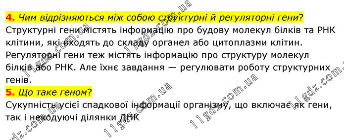 4. Чим відрізняються між собою структурні й регуляторні гени? Структурні гени містять інформацію про будову молекул білків та РНК клітини, які входять до складу органел або цитоплазми клітин. Регуляторні гени теж містять інформацію про структуру молекул білків або РНК. Але їхнє завдання — регулювати роботу структурних генів. 5. Що таке геном? Сукупність усієї спадкової інформації організму, що включає як гени, так і некодуючі ділянки ДНК