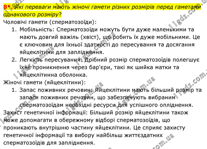 Які переваги мають жіночі гамети різних розмірів перед гаметами однакового розміру? Чоловічі гамети (сперматозоїди): 1. Мобільність: Сперматозоїди можуть бути дуже маленькими та мають довгий важіль (хвіст), що робить їх дуже мобільними. Це є ключовим для їхньої здатності до пересування та досягання яйцеклітини для запліднення. 2. Легкість пересування: Дрібний розмір сперматозоїдів полегшує їхнє проникнення через бар'єри, такі як шийка матки та яйцеклітинна оболонка. Жіночі гамети (яйцеклітини): 1. Запас поживних речовин: Яйцеклітини мають більший розмір та запаси поживних речовин, що забезпечують вибраним сперматозоїдам необхідні ресурси для успішного опліднення. Захист генетичної інформації: Більший розмір яйцеклітини також може допомагати в обережному відборі сперматозоїдів, що проникають внутрішню частину яйцеклітини. Це сприяє захисту генетичної інформації та вибору найбільш життєздатних сперматозоїдів для запліднення.