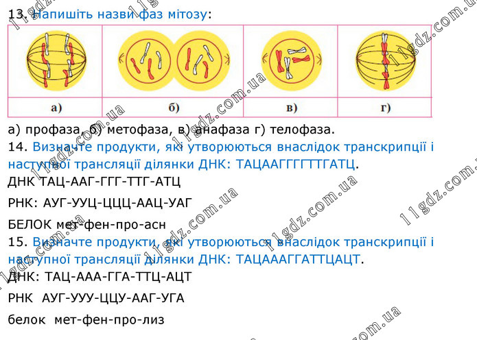 13. Напишіть назви фаз мітозу: а) профаза, б) метофаза, в) анафаза г) телофаза. 14. Визначте продукти, які утворюються внаслідок транскрипції і наступної трансляції ділянки ДНК: ТАЦААГГГГТТГАТЦ. ДНК ТАЦ-ААГ-ГГГ-ТТГ-АТЦ РНК: АУГ-УУЦ-ЦЦЦ-ААЦ-УАГ БЕЛОК мет-фен-про-асн 15. Визначте продукти, які утворюються внаслідок транскрипції і наступної трансляції ділянки ДНК: ТАЦАААГГАТТЦАЦТ. ДНК: ТАЦ-ААА-ГГА-ТТЦ-АЦТ РНК АУГ-УУУ-ЦЦУ-ААГ-УГА белок мет-фен-про-лиз