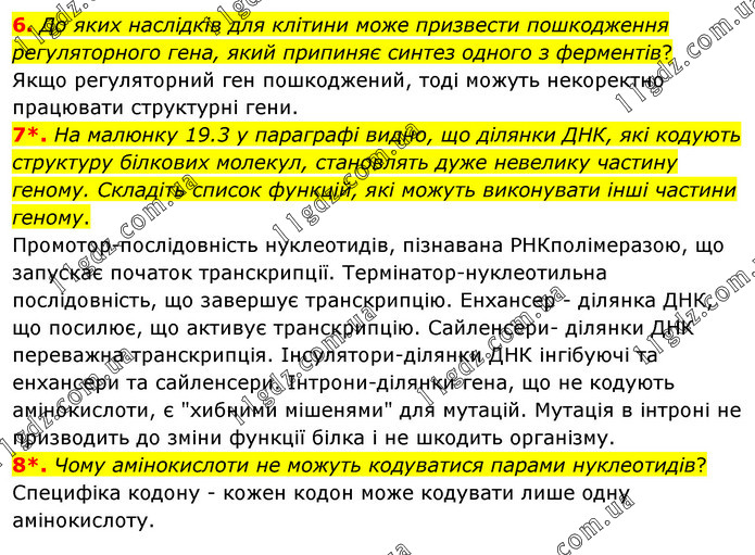 6. До яких наслідків для клітини може призвести пошкодження регуляторного гена, який припиняє синтез одного з ферментів? Якщо регуляторний ген пошкоджений, тоді можуть некоректно працювати структурні гени. 7*. На малюнку 19.3 у параграфі видно, що ділянки ДНК, які кодують структуру білкових молекул, становлять дуже невелику частину геному. Складіть список функцій, які можуть виконувати інші частини геному. Промотор-послідовність нуклеотидів, пізнавана РНКполімеразою, що запускає початок транскрипції. Термінатор-нуклеотильна послідовність, що завершує транскрипцію. Енхансер - ділянка ДНК, що посилює, що активує транскрипцію. Сайленсери- ділянки ДНК переважна транскрипція. Інсулятори-ділянки ДНК інгібуючі та енхансери та сайленсери. Інтрони-ділянки гена, що не кодують амінокислоти, є "хибними мішенями" для мутацій. Мутація в інтроні не призводить до зміни функції білка і не шкодить організму. 8*. Чому амінокислоти не можуть кодуватися парами нуклеотидів? Специфіка кодону - кожен кодон може кодувати лише одну амінокислоту.