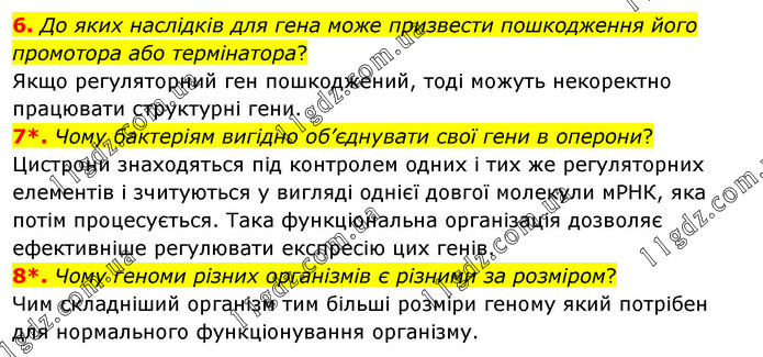 6. До яких наслідків для гена може призвести пошкодження його промотора або термінатора? Якщо регуляторний ген пошкоджений, тоді можуть некоректно працювати структурні гени. 7*. Чому бактеріям вигідно об’єднувати свої гени в оперони? Цистрони знаходяться під контролем одних і тих же регуляторних елементів і зчитуються у вигляді однієї довгої молекули мРНК, яка потім процесується. Така функціональна організація дозволяє ефективніше регулювати експресію цих генів. 8*. Чому геноми різних організмів є різними за розміром? Чим складніший організм тим більші розміри геному який потрібен для нормального функціонування організму.