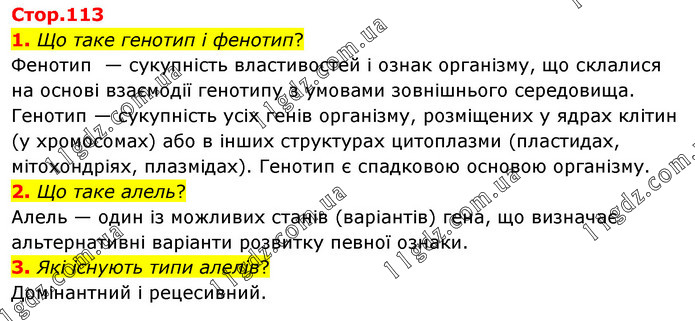 1. Що таке генотип і фенотип? Фенотип — сукупність властивостей і ознак організму, що склалися на основі взаємодії генотипу з умовами зовнішнього середовища. Генотип — сукупність усіх генів організму, розміщених у ядрах клітин (у хромосомах) або в інших структурах цитоплазми (пластидах, мітохондріях, плазмідах). Генотип є спадковою основою організму. 2. Що таке алель? Алель — один із можливих станів (варіантів) гена, що визначає альтернативні варіанти розвитку певної ознаки. 3. Які існують типи алелів? Домінантний і рецесивний.